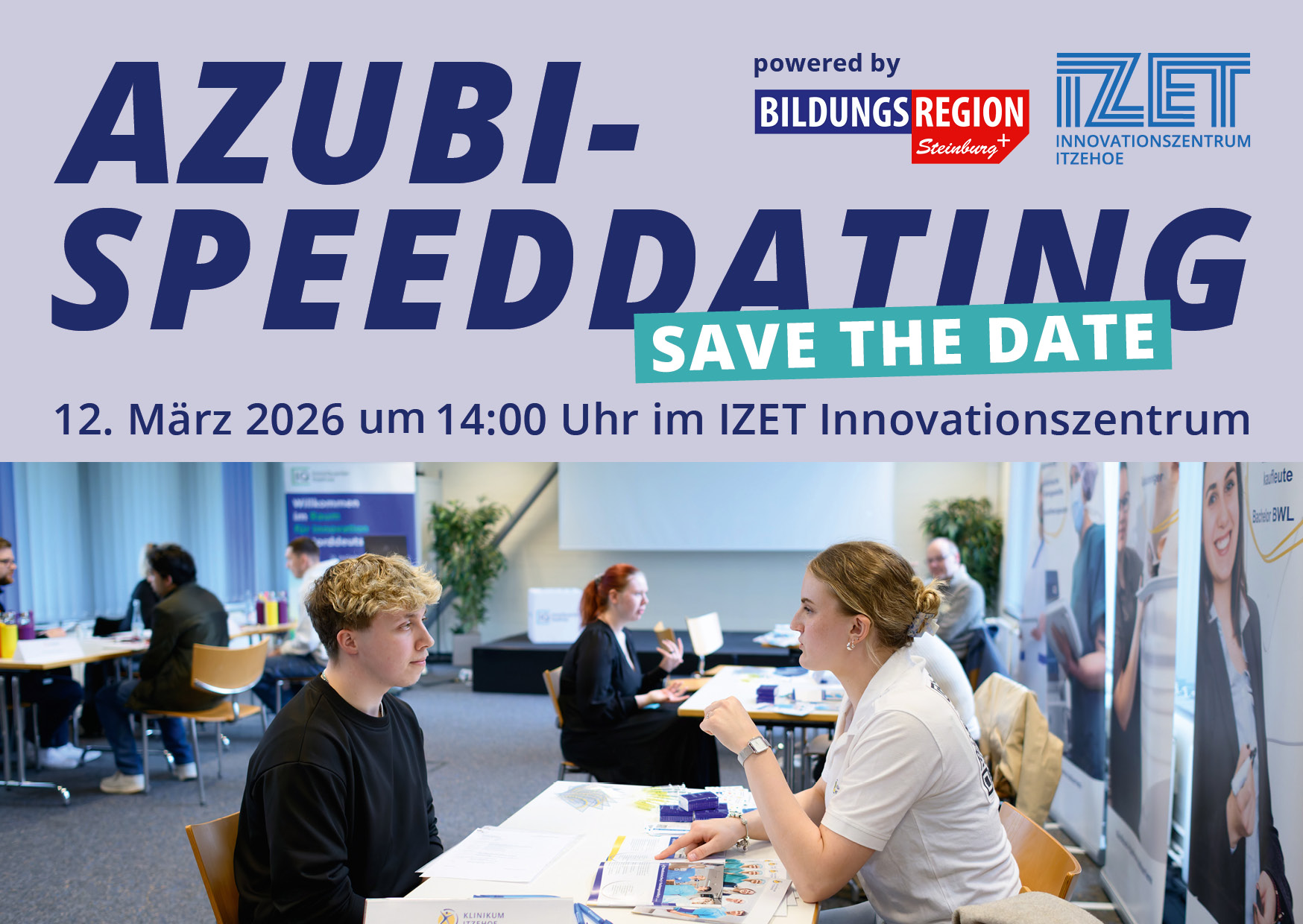 Aufgrund der vielen positiven Rückmeldungen findet unser 3. Azubi-SpeedDating am Donnerstag, den 12. März 2026 im Innovationszentrum IZET, Fraunhoferstraße 3, 25524 Itzehoe statt.